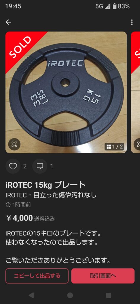 実はこれまでウエイトトレーニングに使っていたバーベルのプレートをメルカリで売ってしまいました。